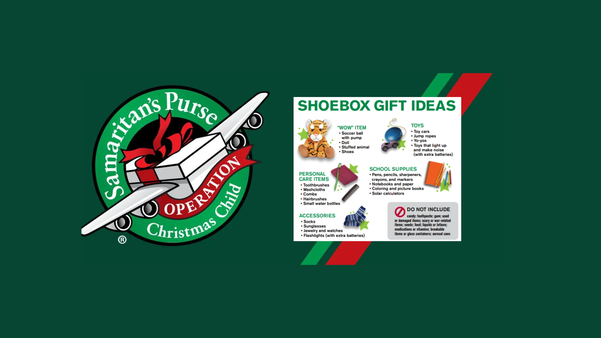Operation Christmas Child is such a special way to give to a child in need. If you want to fill a box, you can pick one up at the church. There are instructions included in the box.